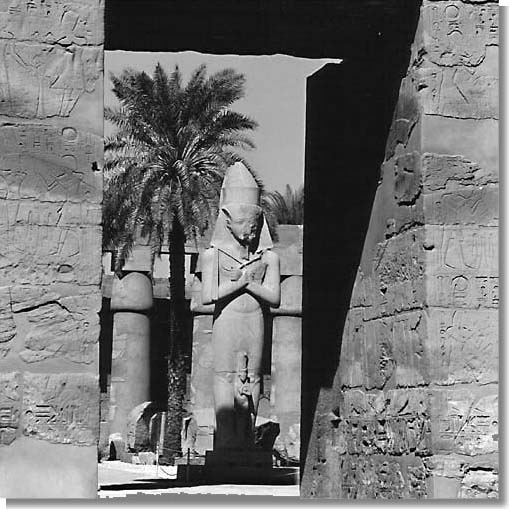 Eine Kolossalstatue Ramses II. mit seiner Tochter zu Füßen im Amun-Tempel von Karnak.